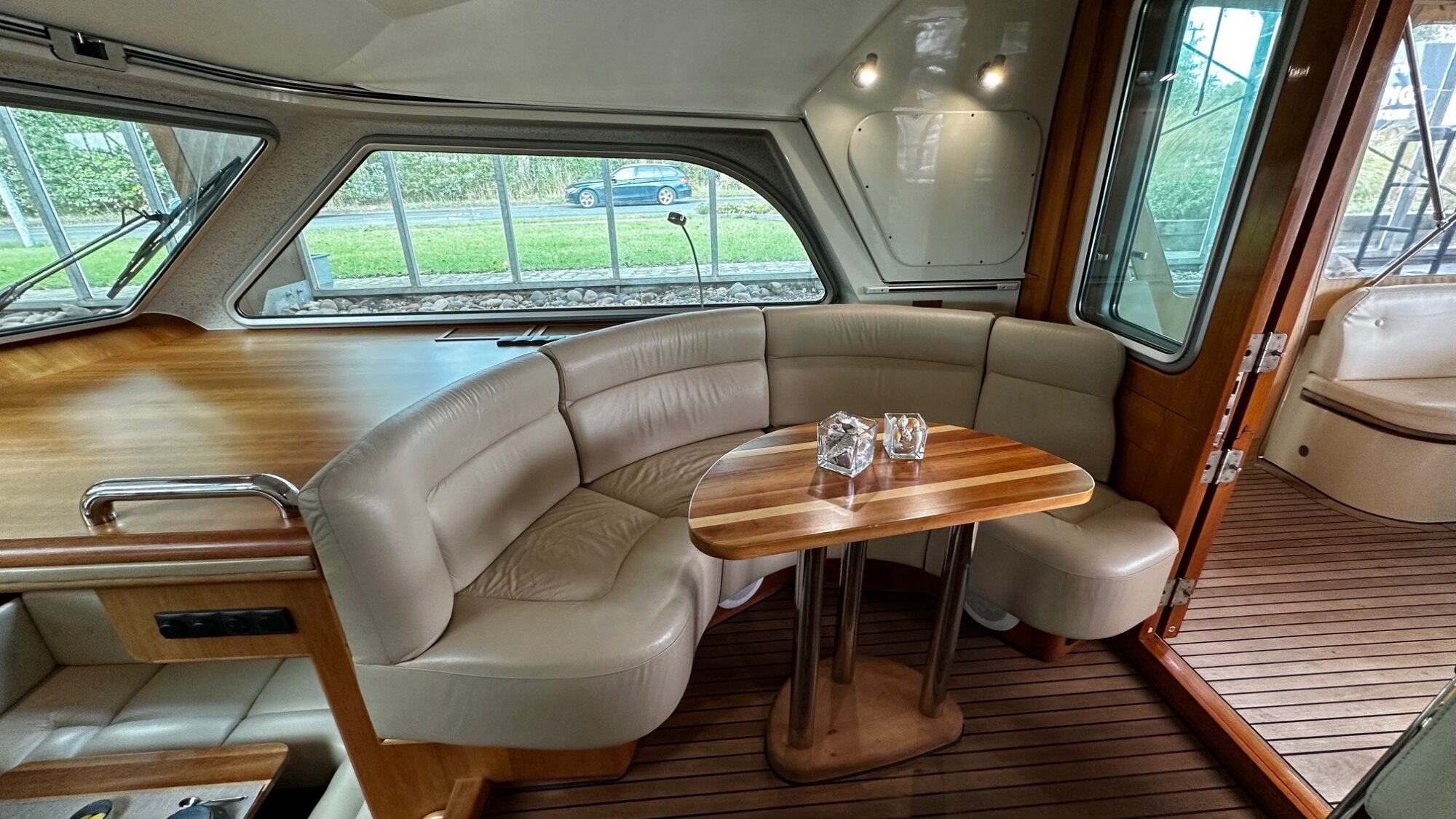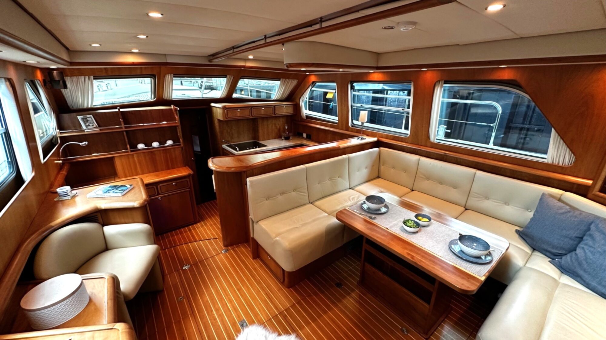 Salon with large angular seating area, navigation corner and large galley