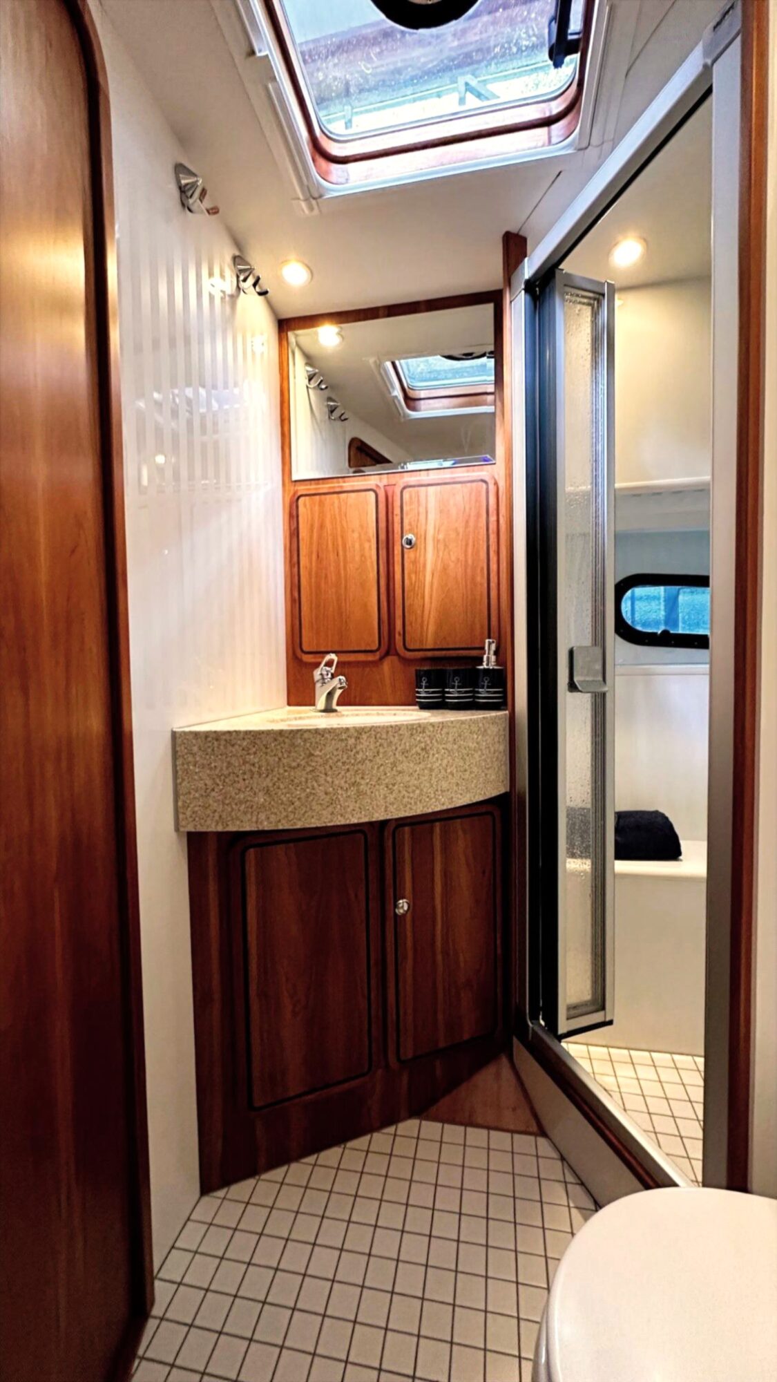 Forward cabin with large V-berths, wet room and shower
