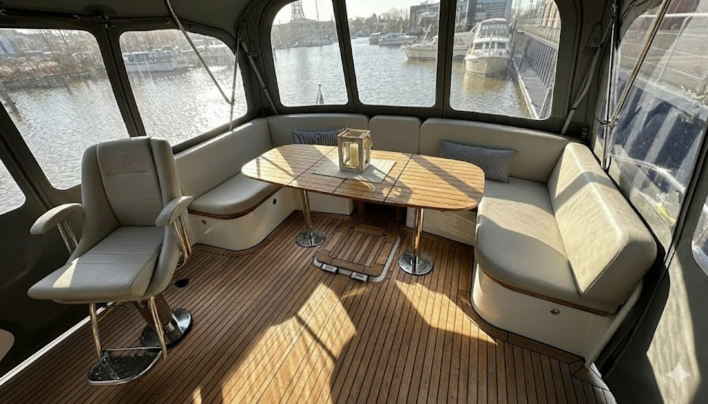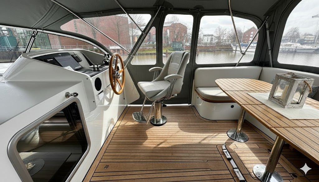 Original Linssen Teakdeck auf Achterdeck, inkl. Treppenstufen und auf Fluchtluk